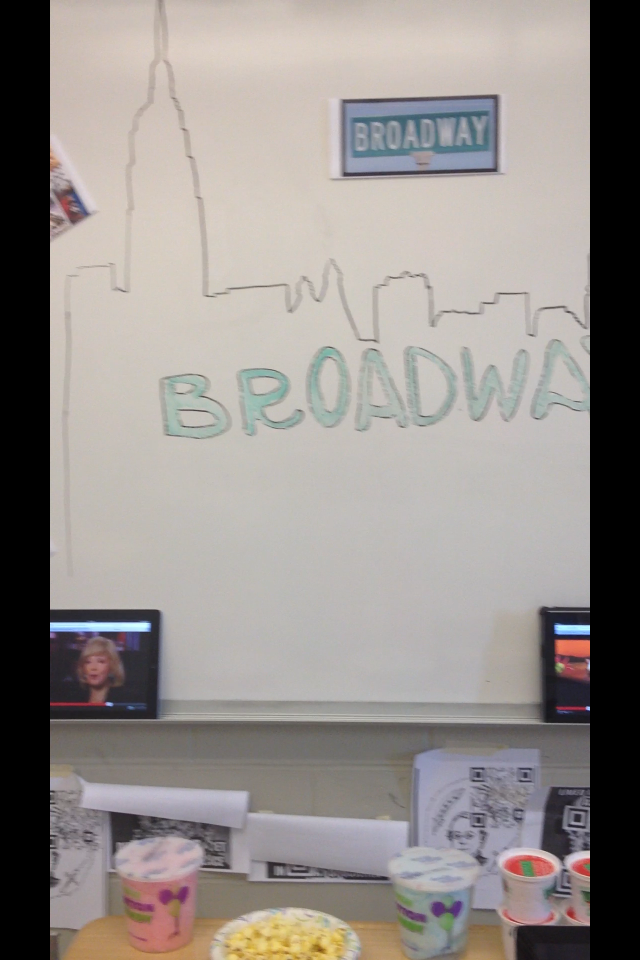 One of the groups chose to create the Theater District neighborhood in the classroom. When the judges came into the classroom the students had used their iPad research to help them draw visuals from the neighborhood. Also, their was a technology integration portion to the contest: my students found a video of the musical CATS that they had playing on one iPad, next to a Keynote created about the Theater District, while another iPad displayed a stunning visual of a B Way Theater. My student also placed popcorn, cotton candy, and ices in a beautiful display in front of their bevy of iPads. They were also able to print 42nd ST. signs and other stunning visuals from their iPads.