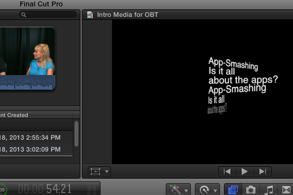 Now that I am back home and I am getting the experience to “get my hands dirty” as I work on the three very different final projects in FCP. I made a movie about the Three Little Pigs this week with my kindergarten students, I edited the app-smashing interview footage for my OBT chapter this weekend, and I am preparing an engagement party video for my niece and her fiancée for next weekend. These were three very different tasks but the bottom line is that working with FCP in each one them has been SWEET.