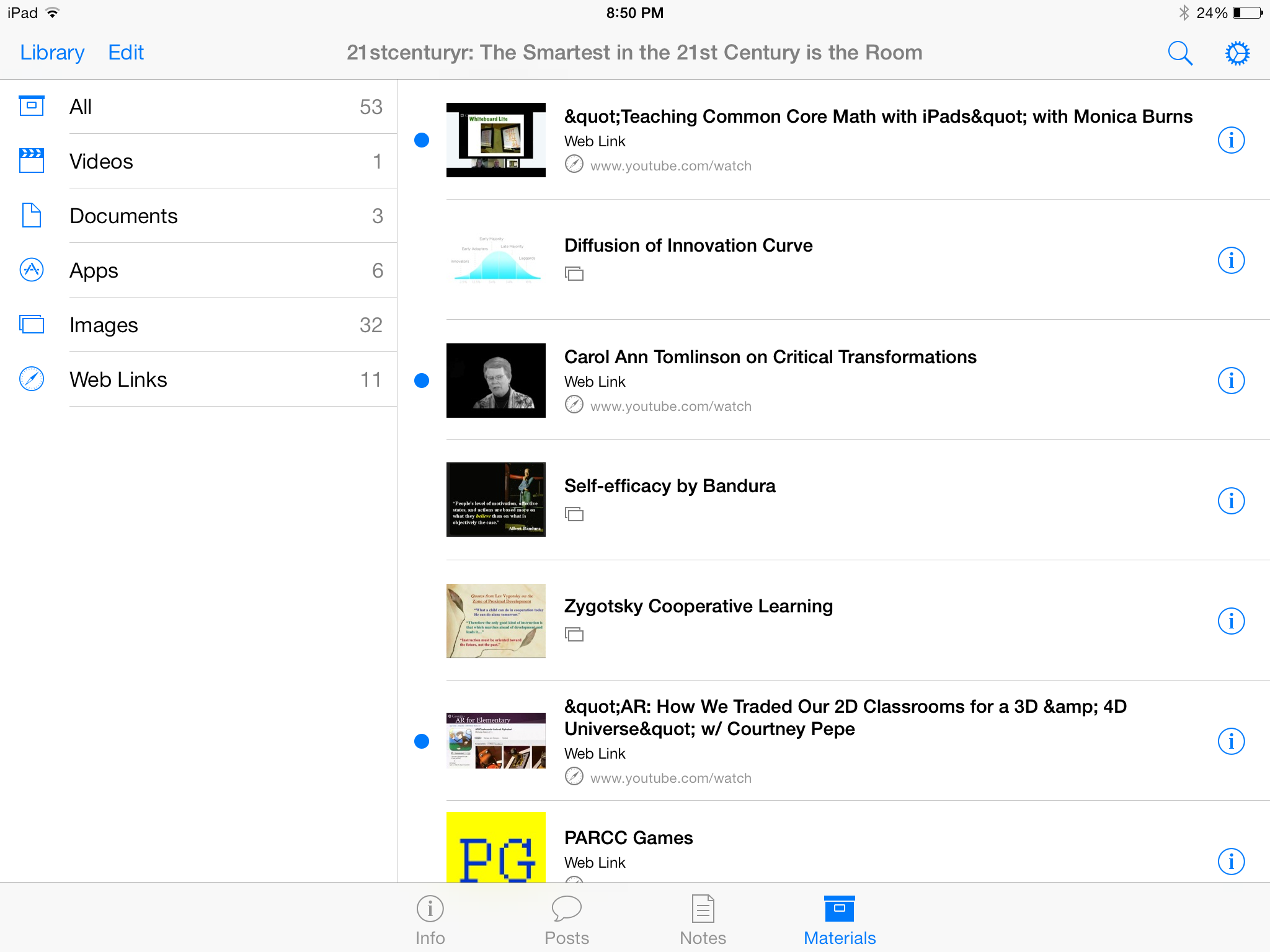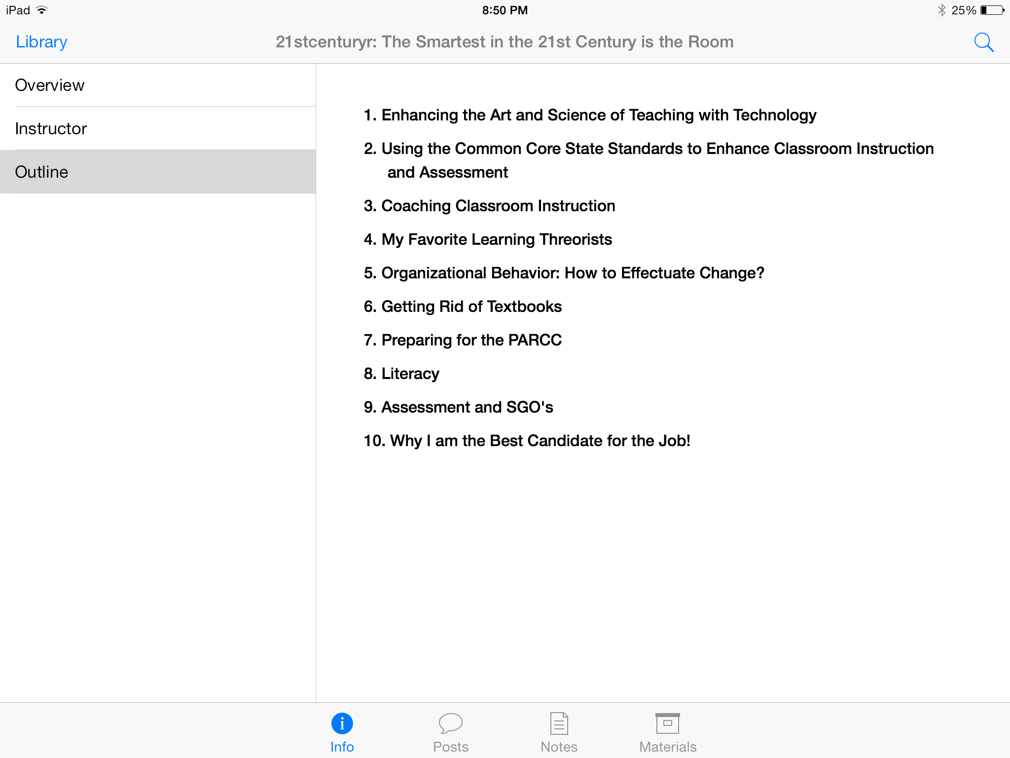 I was able to to use the outline function in iTunes U to highlight salient points that I wanted to speak about during the interview. Also, because of the materials function I was able to add screenshots of quotes from some of my favorite learning theorists: Vygotsky, Bandura, Tomlinson, and Gardner.