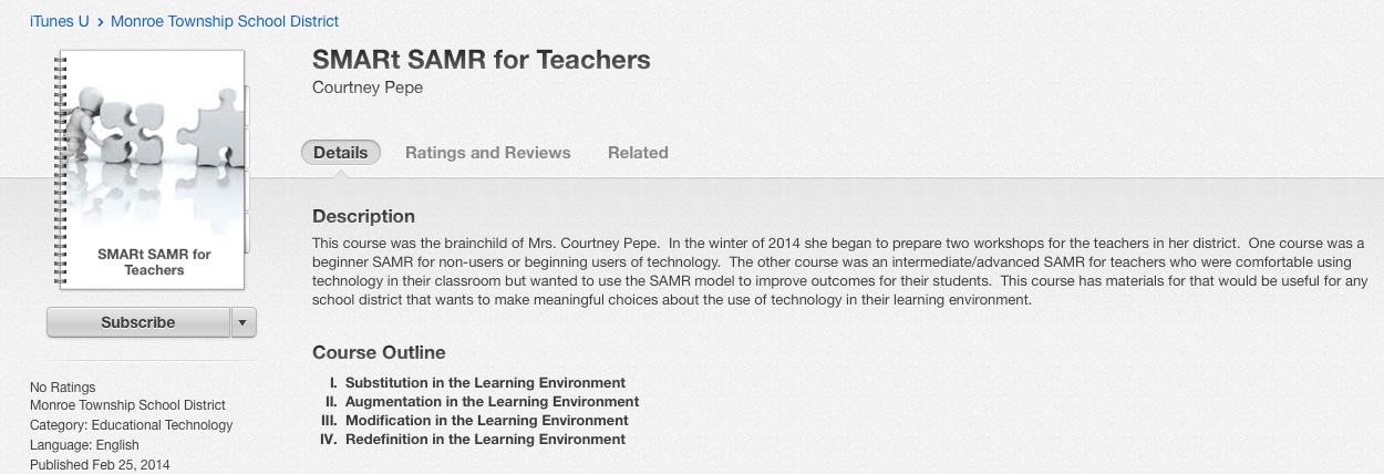 This month I embarked upon an ambitious task. I decided to create and teach two separate SAMR two and a half hour workshops on one day. The morning workshop was geared towards beginning users or non-users of the technology. The afternoon workshop was geared towards intermediate and advanced users of the technology. I created an iTunes University public course complete with assignments, apps, and tutorial videos. Perhaps you can use this in your learning environment.
