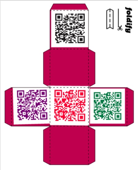 I took four basic elements of a story 1) characters 2) setting 3) conflict 4) solution, I made a short Tellagami explaining and each concept. Then I published the Tellagamis on my You Tube Channel. Next I made four different color QR Codes that I linked to the Tellagami videos. Then I imported the QR Codes into the Foldify app and dragged them onto 4 different sides of a cube. In this case I constructed the cube for my students because I had a short period of time to work with them. When I use this app with high school students I have them build the cubes. The students took turns shaking the cube like a Story Dice, and they scanned the colored QR Codes and we had a wonderful class discussion about the various parts of a story.